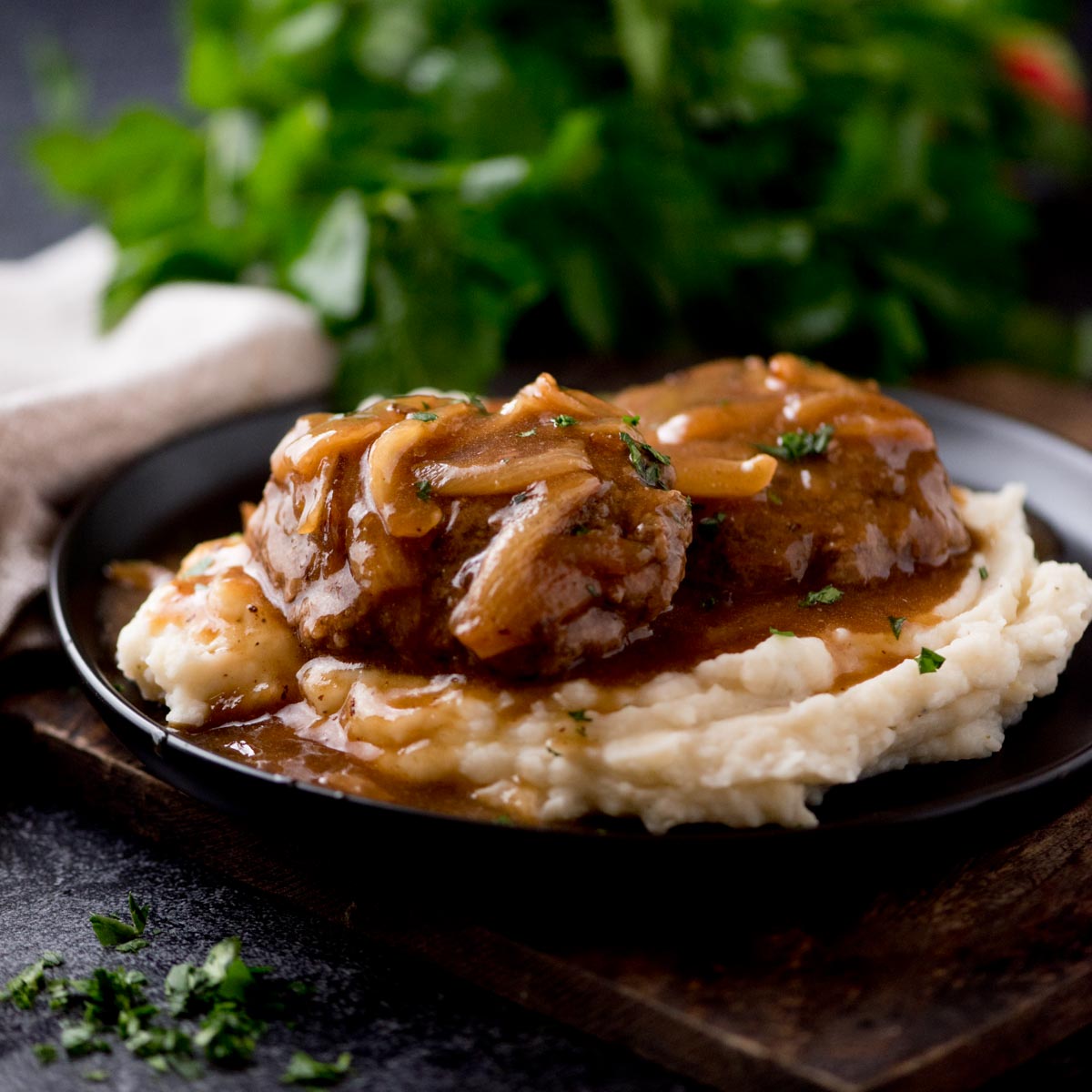 Hamburger Steak w/onions, Mashed potatoes and side Asparagus